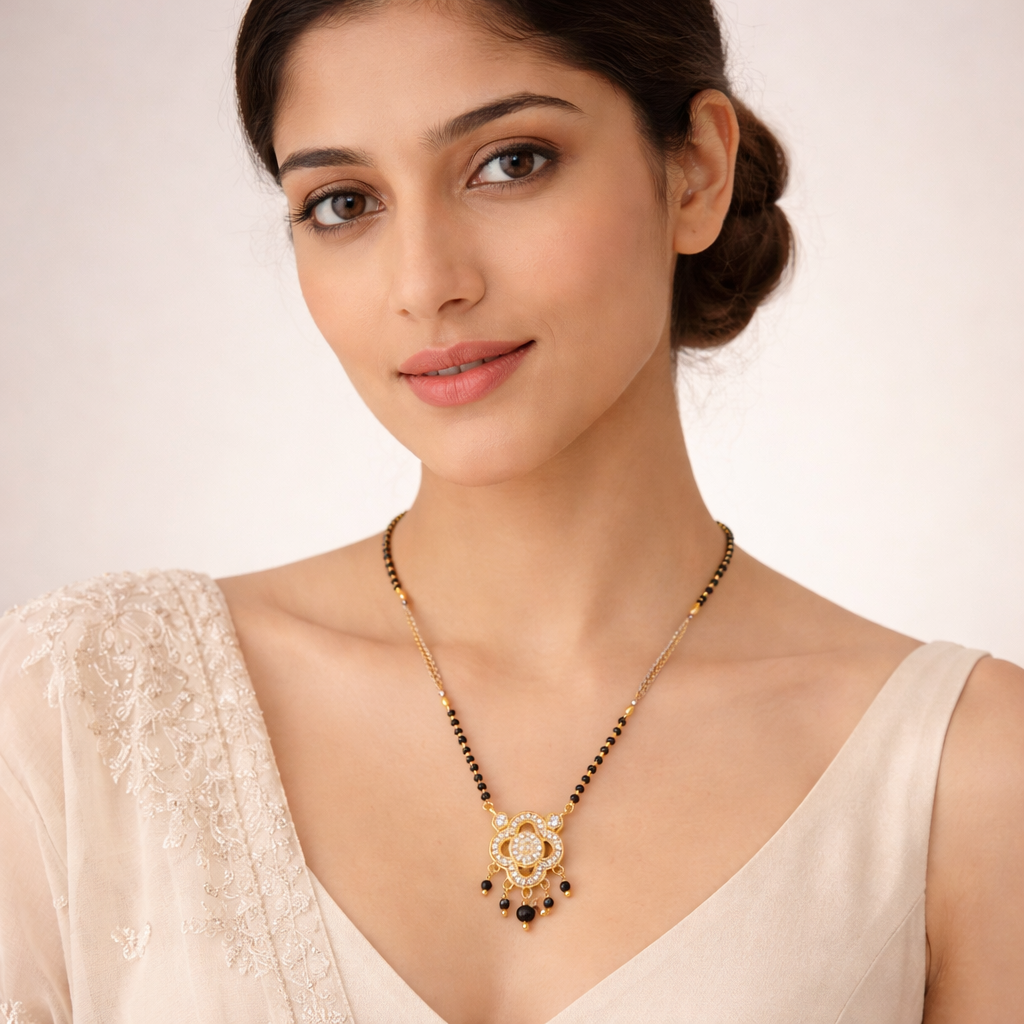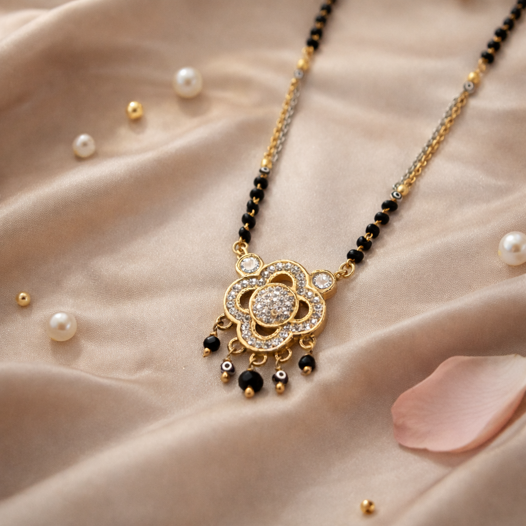 The highlight of this mangalsutra is its floral-inspired pendant, crafted with soft curves and outlined in a polished gold finish. The center of the pendant is adorned with shimmering crystal stones, creating a subtle sparkle that enhances the floral motif. Multiple tiny black bead drops suspended below the pendant add gentle movement and lend a refined finishing touch to the design.