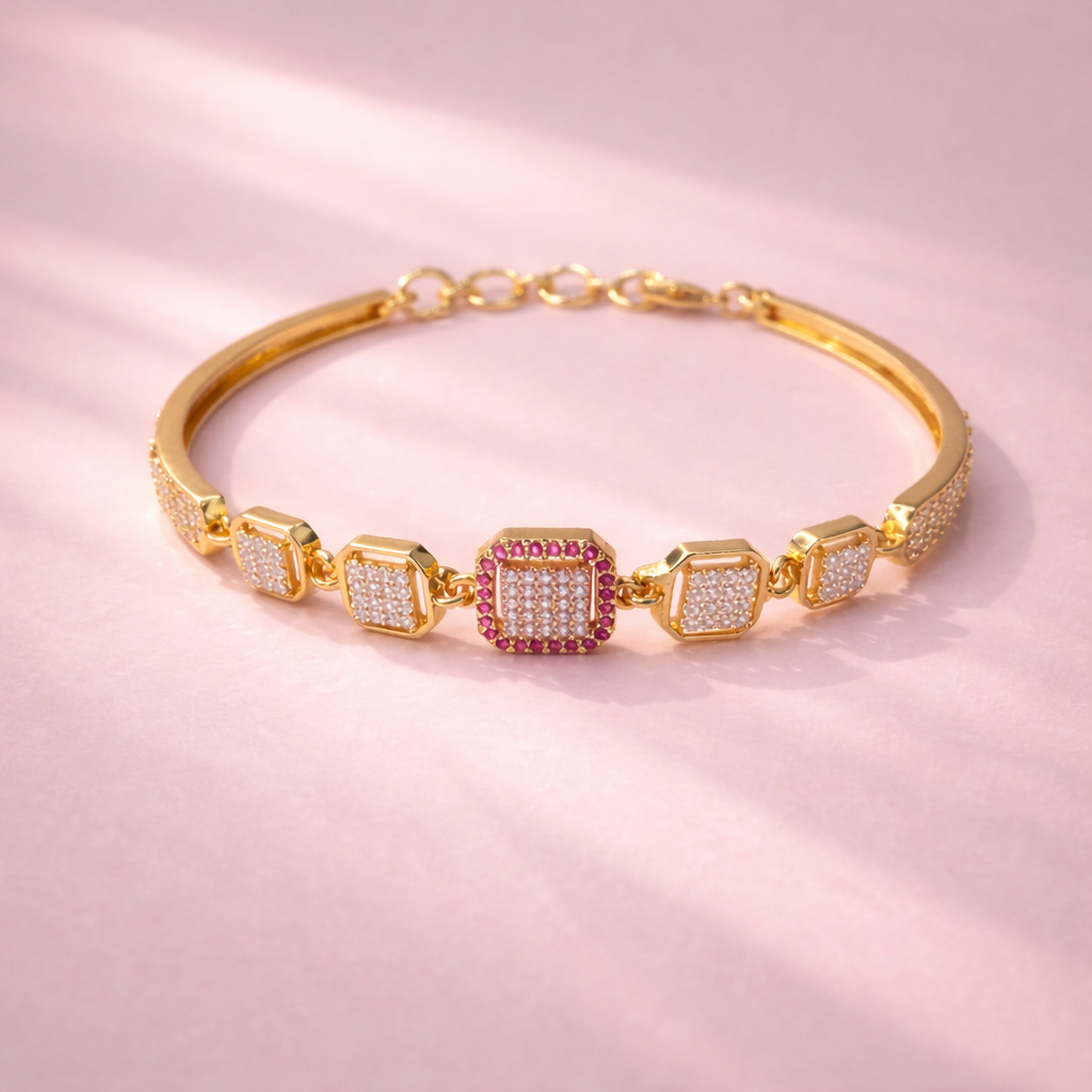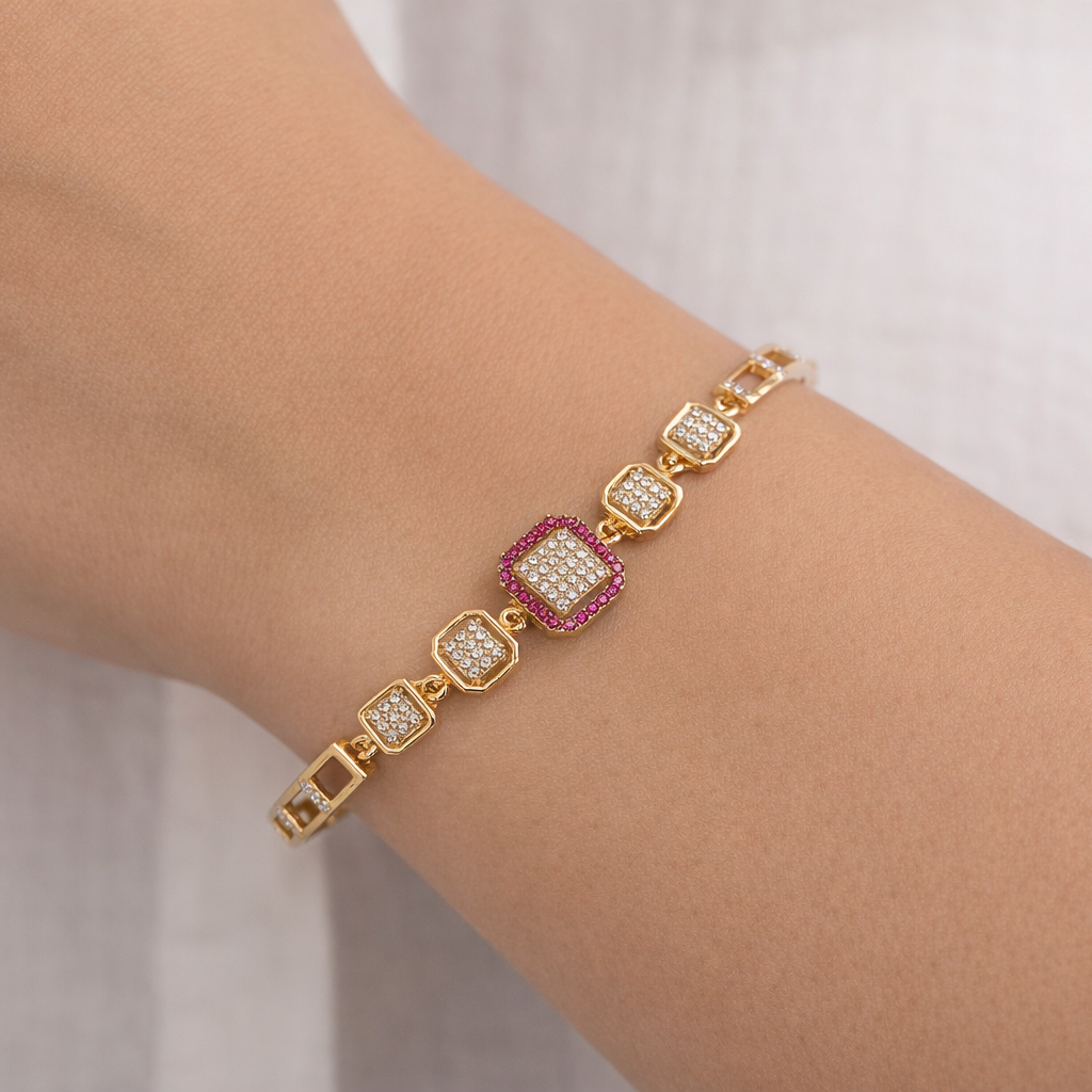 The centerpiece of the bracelet showcases a square-shaped motif, beautifully highlighted with shimmering clear crystals and framed by rich ruby-colored stone accents. Flanked by matching square crystal links on either side, the design maintains perfect symmetry and balance. The polished gold finish enhances the brilliance of the stones, giving the bracelet a premium, high-end appeal.
