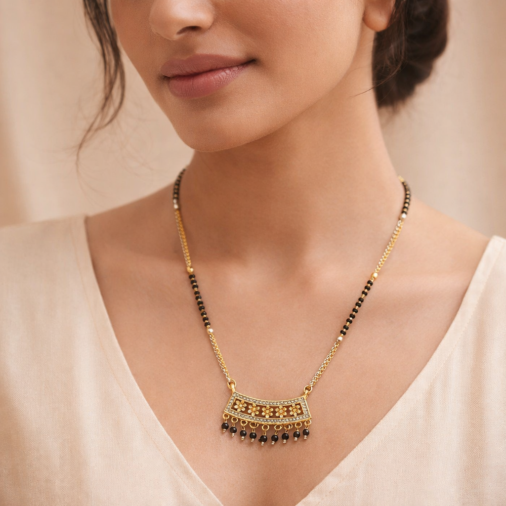The highlight of this mangalsutra is its rectangular temple-style pendant, adorned with intricate gold detailing and bordered with subtle crystal accents for a refined shimmer. The pendant is finished with a row of tiny black bead danglers, creating gentle movement and adding depth to the design. The structured pendant shape combined with soft hanging elements gives this piece a balanced and elegant appearance.